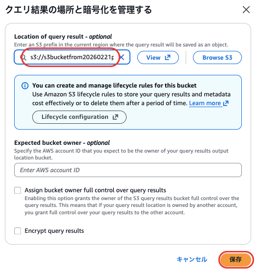 - 管理を開き、「クエリ結果の場所」に保存先S3バケットを選択